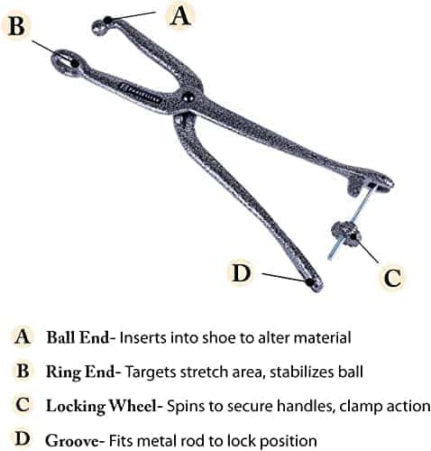 - APPLICATIONS : Conçu pour être à la fois solide et durable, le tendeur de boules et d’anneaux a été construit pour durer. Cet outil d’étirement est idéal pour les chaussures en cuir comme les chaussures de ville. Il peut convenir à certains types de bottes (si elles ne sont pas lacées), mais il a été conçu à l’origine pour des chaussures de ville. L’extrémité de la boule et de l’anneau, qui s’insère dans la chaussure, est courte, de sorte qu’il sera plus difficile d’insérer le brancard dans les chaussures qui ont plus de quatre œillets.