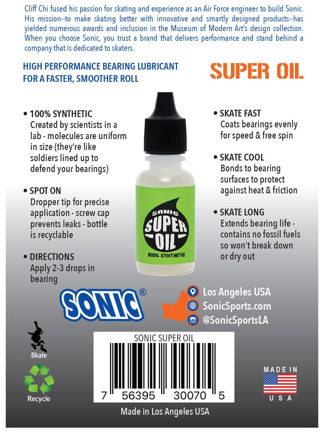 Sonic Super Oil lubricates skate bearings and coats them uniformly to increase speed and free spin. This Sonic Super Oil is 100% synthetic oil with no fossil fuels to allow for a long last that won’t dry out. A must have for anyone that services their bearings. For optimal performance, always choose Sonic Super Oil.