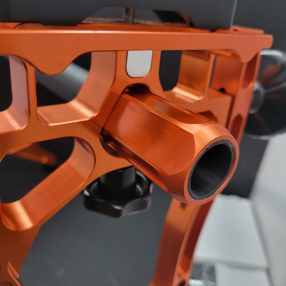- Carbon Crossbar with aluminum ends: The crossbar is round and made out of carbon. Each end has an aluminum ring (hexagonal) that makes the jig able to fit 16″ to 19″ blades.